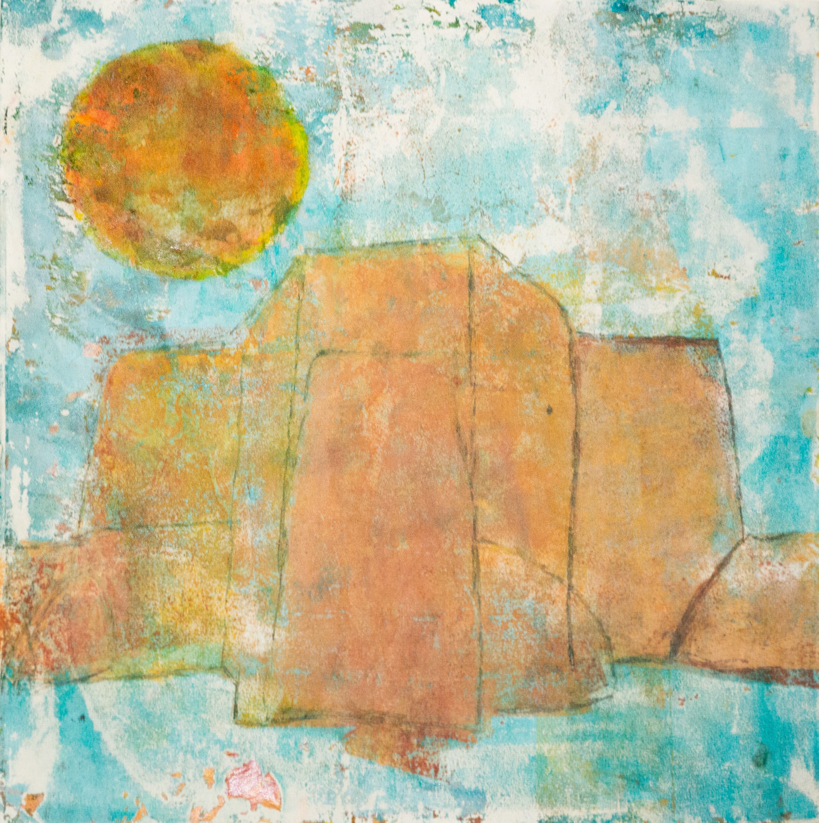 In this vibrant and lively Monotype, the Taos architecture and its cultural significance are brought to life through a mix of mix media, collage, drawing and ink on transfer film to print on collage paper.